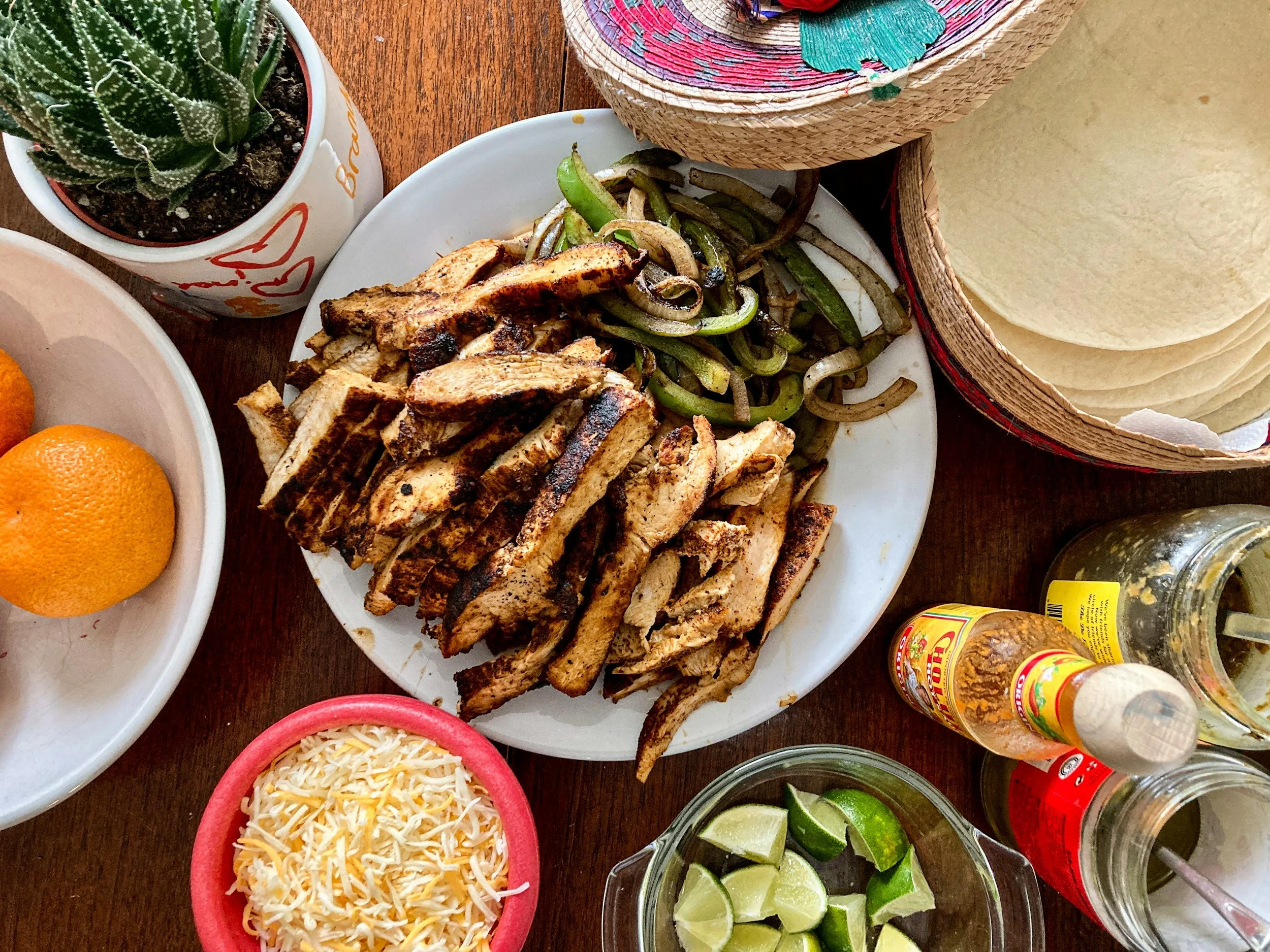 Chicken Breast Fajitas, Real Mexi-Red Rice, Cilantro Herb Onion, Jalapeño Mix | Page Prawns Fajitas, Mexi-Red Rice, Cilantro Herb Onion Jalapeño Mix Topping